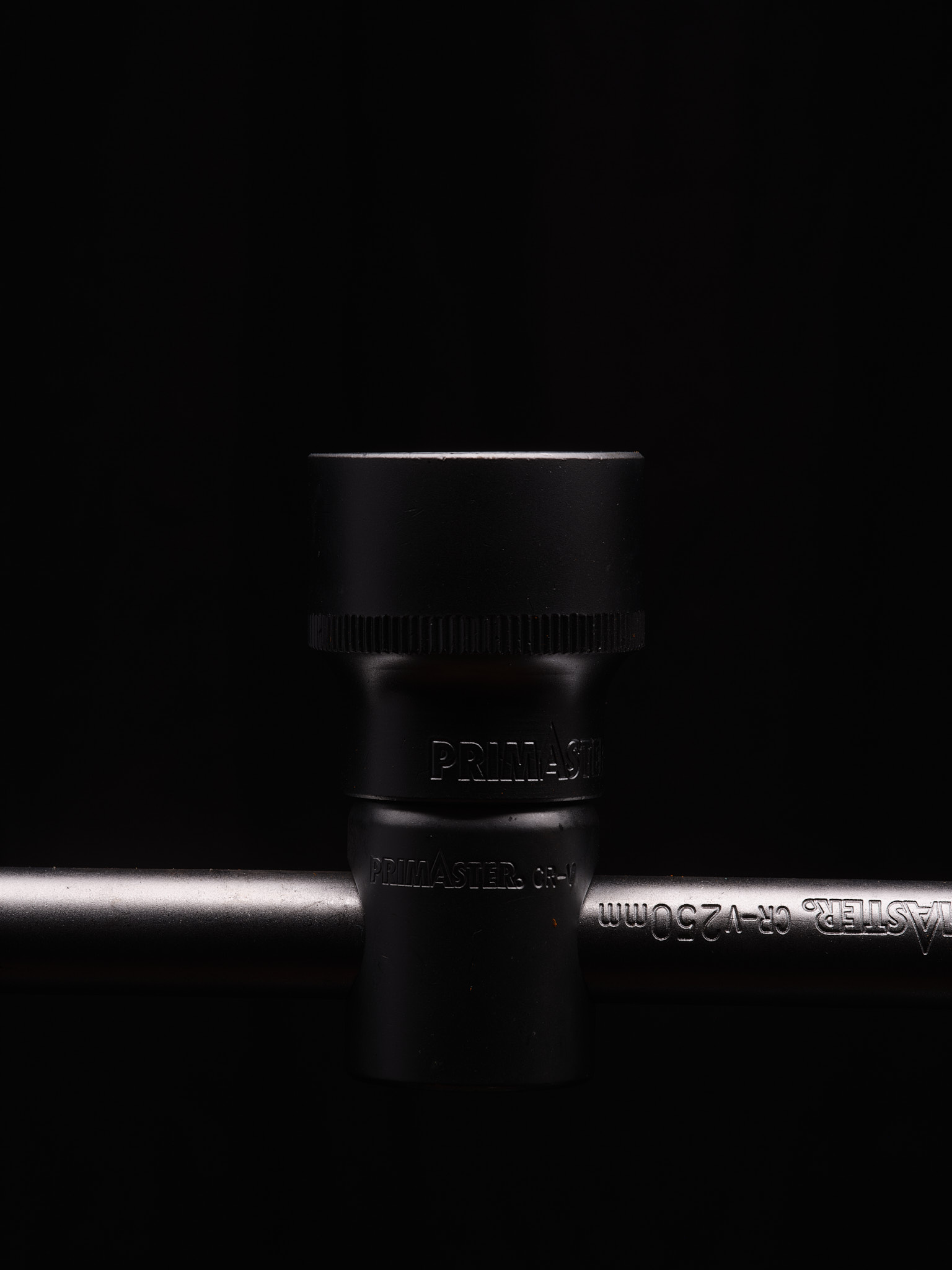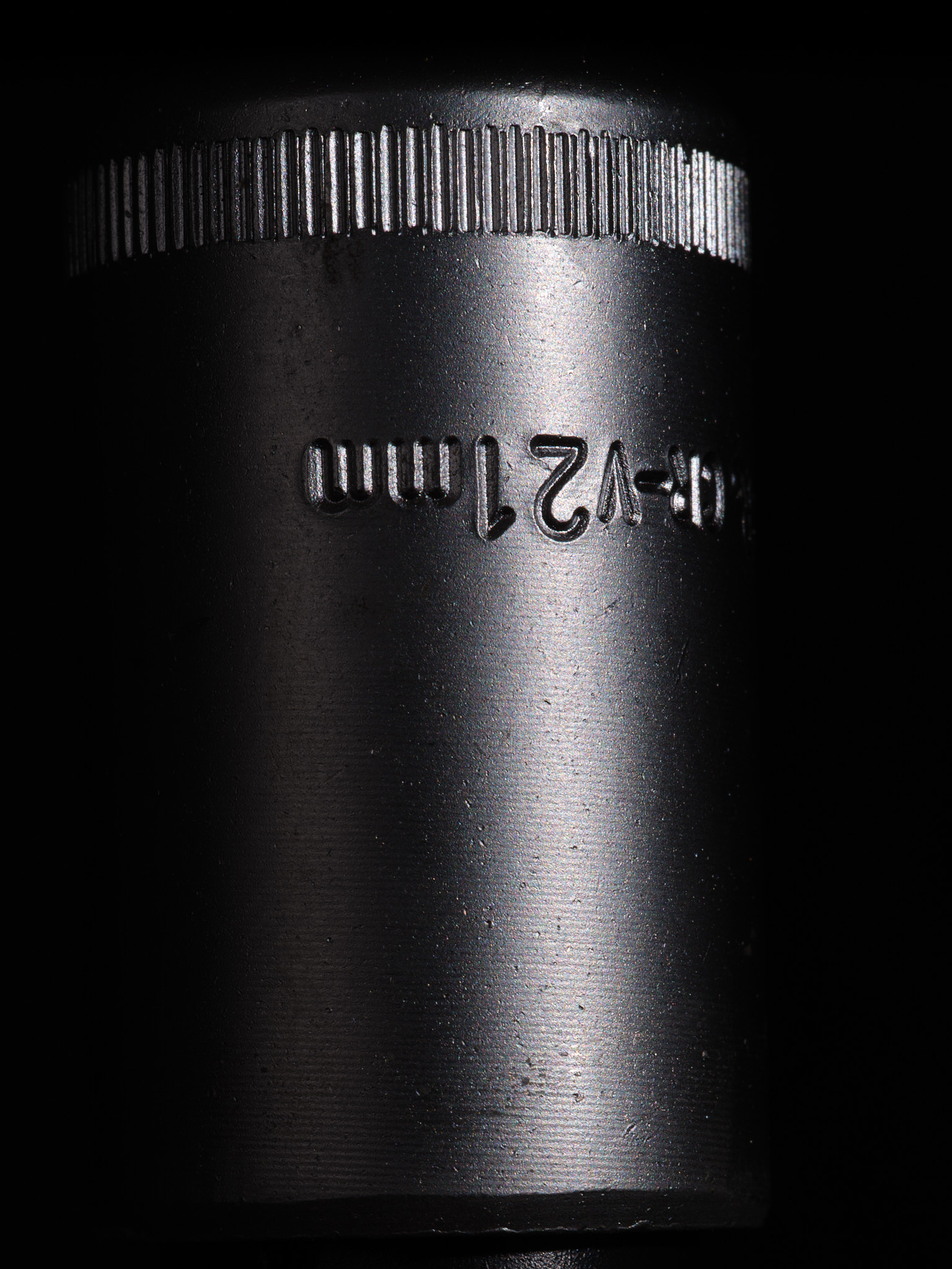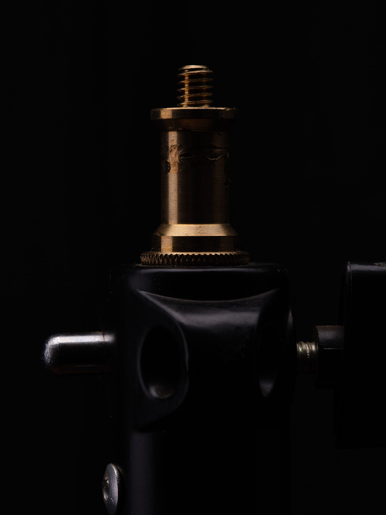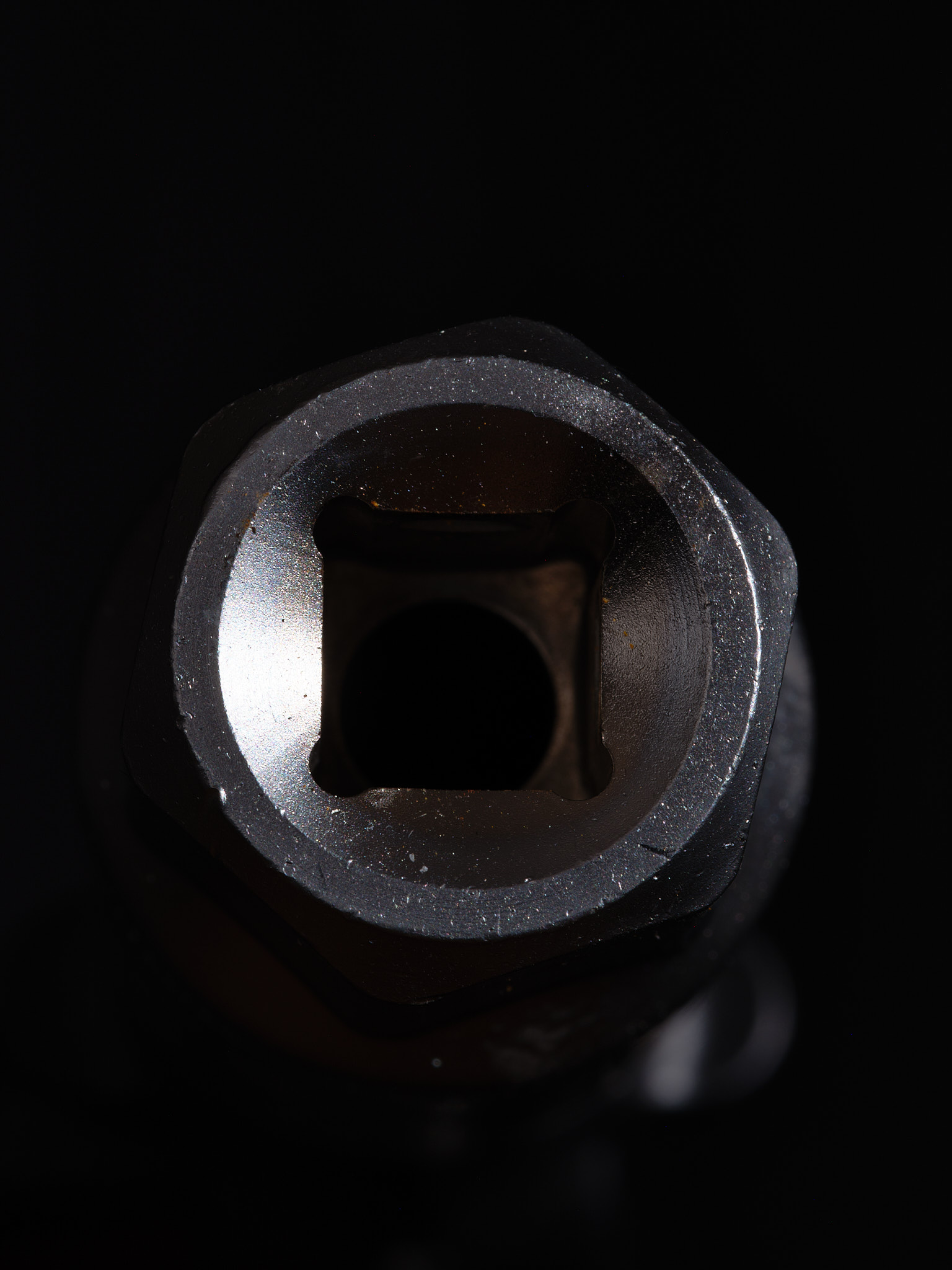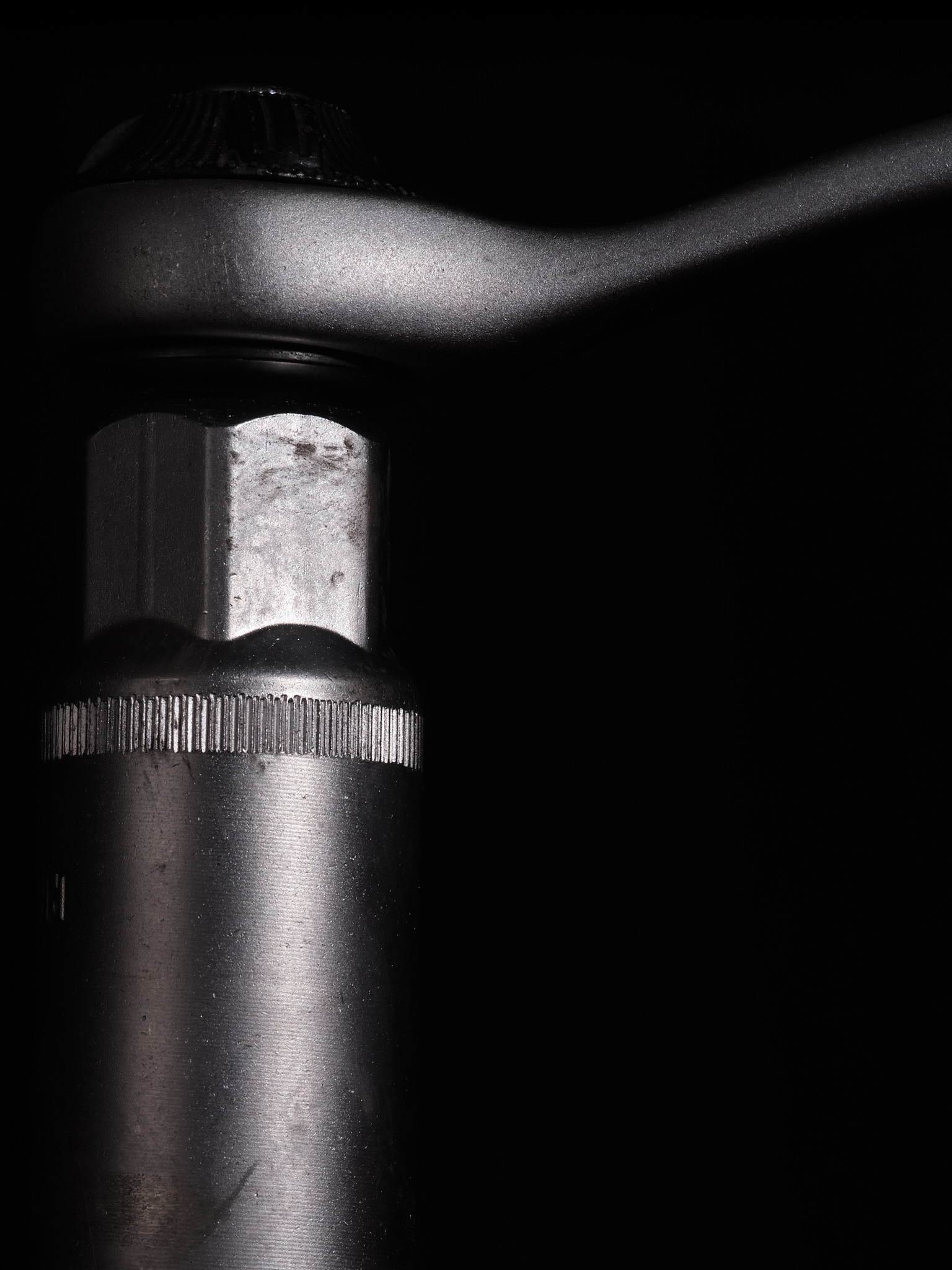 Dann stellt sich die Frage nach der Beleuchtung, die ich mir in diesem Fall teils mit einem Projektionsspot und teils mit einem Striplight beantwortet habe. Weil es sich um verchromtes Werkzeug handelt, das kontrastreiches Licht vertragen kann, wurden die Schatten nicht aufgehellt. Es ging also nicht um feine Grauwerte, sondern um starke Kontraste, die das Metall und seine Bearbeitungs- und Nutzungsspuren hervorheben sollten. Ein bisschen angesammelten Staub habe ich auch auf einem meiner Leuchtenstative belassen, weil man so die Detailauflösung ein bisschen erkennen kann. Das ist im Grunde mein „Versuchsaufbau“.
